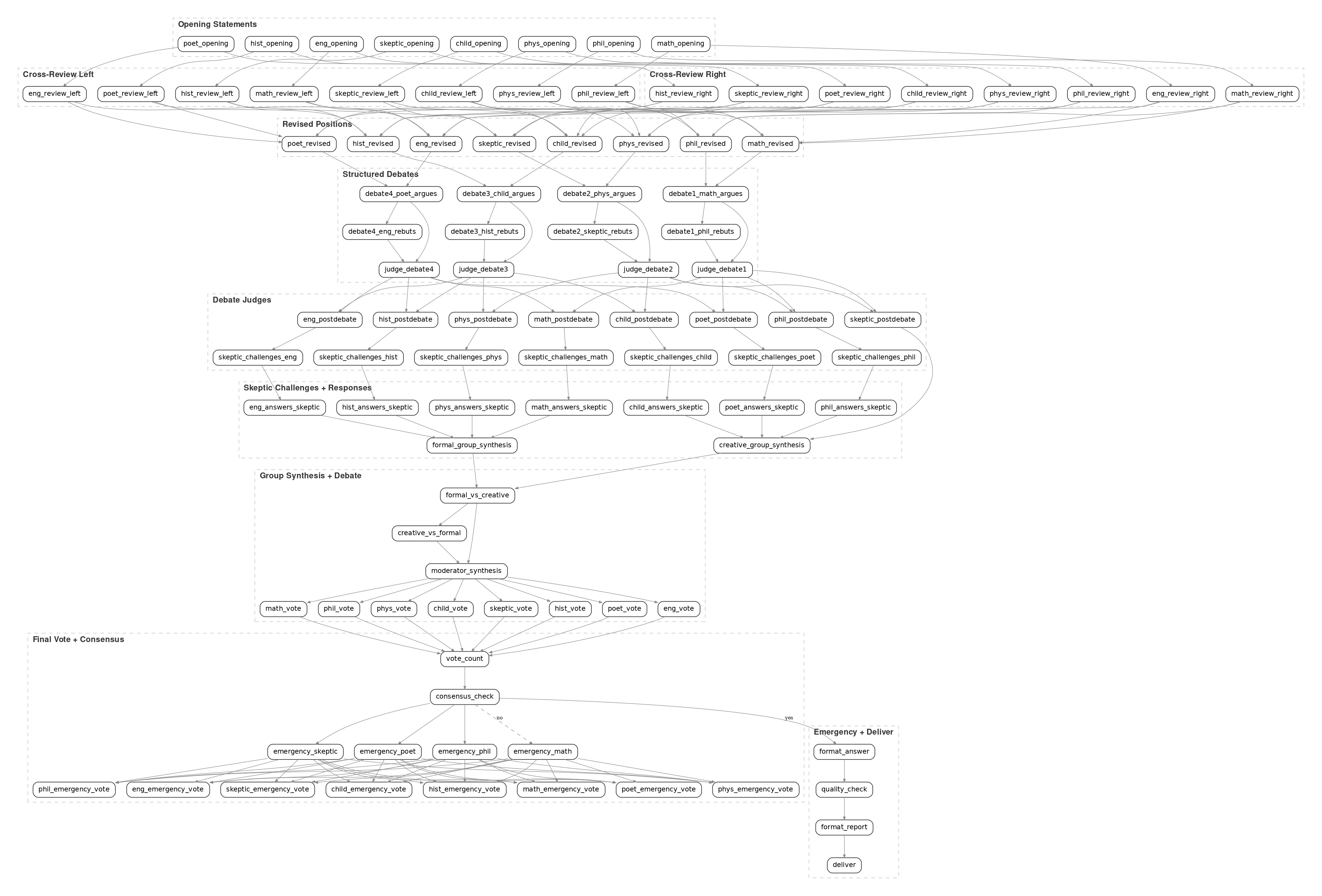 The conditional branch at Phase 14 is the interesting part. If 75% of specialists agree, skip to formatting. If not, trigger emergency rounds. In this run, consensus was 100%, so the emergency path never fired. But it's there.